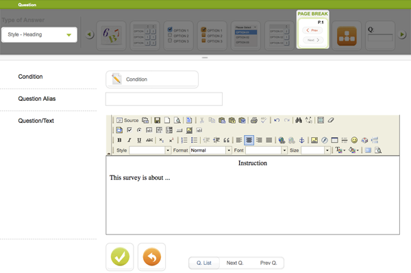 It is a message area, usually used for introduction and/or instruction in the beginning of the survey or as section heading. It is equipped with a text editor to facilitate the editing.