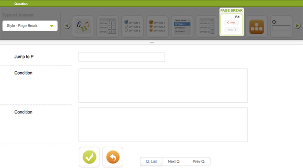 - Condition: coding in javascript is allowed to add features and functions to the survey. For detail, please refer to Page Break Condition section.